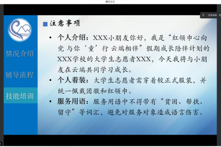 对十七中学生进行义务辅导和暑期的云端陪伴是山海青年志愿服务队开展的第12、 13期活动。在活动开始前山海青年志愿服务队在线上召开了山海青年志愿服务队出征仪式暨暑假少先队志愿陪伴培训会,会议主要内容为优秀志愿者经验分享及活动流程介绍,对将要进行对接陪伴的正式队员进行培训,传授温情守护本领,传承志愿服务精神,从而进一步帮助志愿者更好地投入志愿工作。